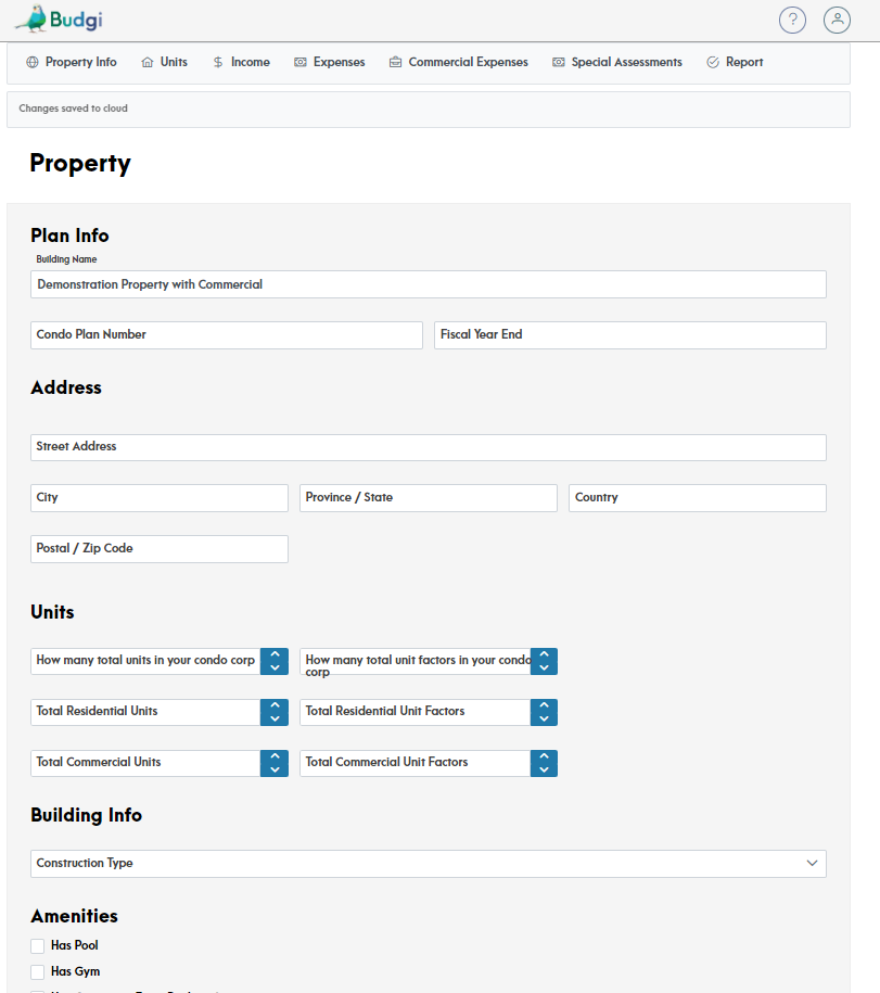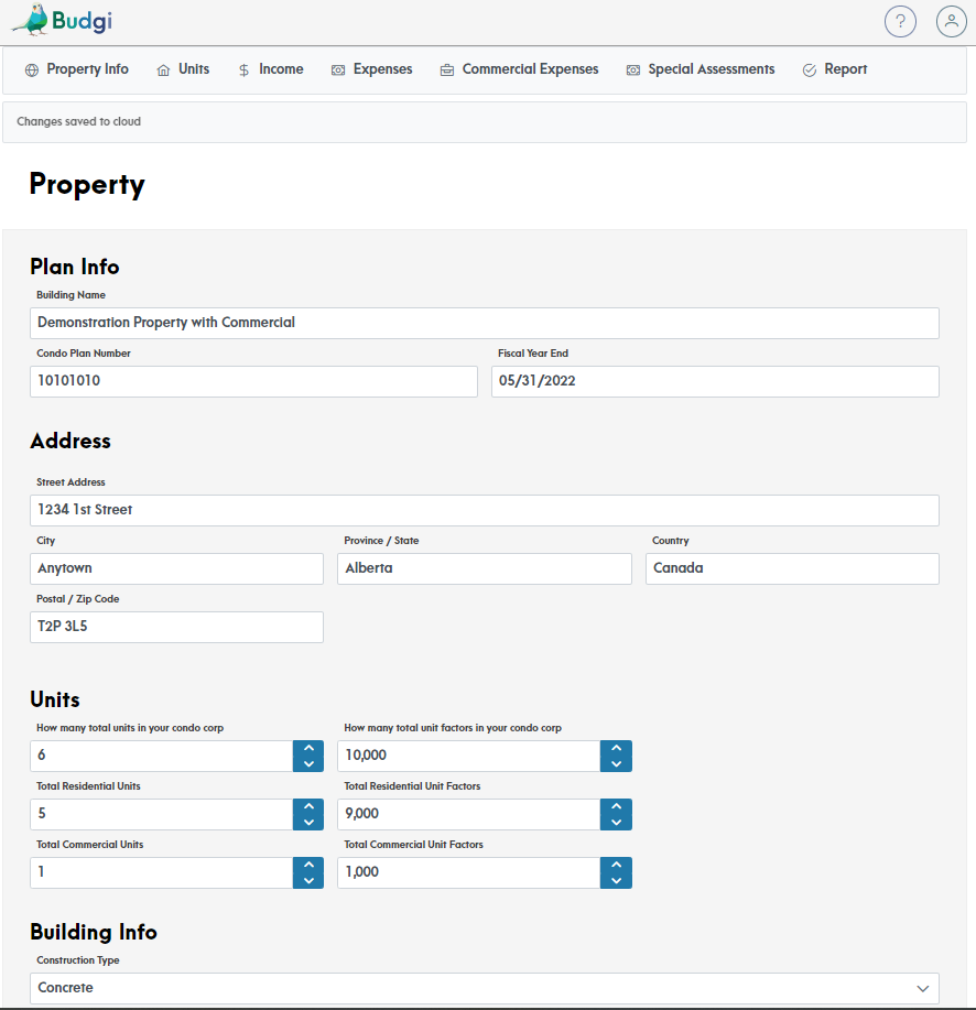 Fill out all the fields with the appropriate information. Total Building Units is the total of Residential Units (suites/condos etc) plus the number of Commercial Units. Ensure that the Commercial plus Residential add up to the total! As for the construction type, pool, gym, concierge info that’s Budgi asking for some data to help us get to know our users.