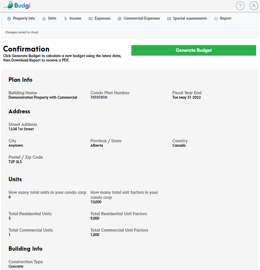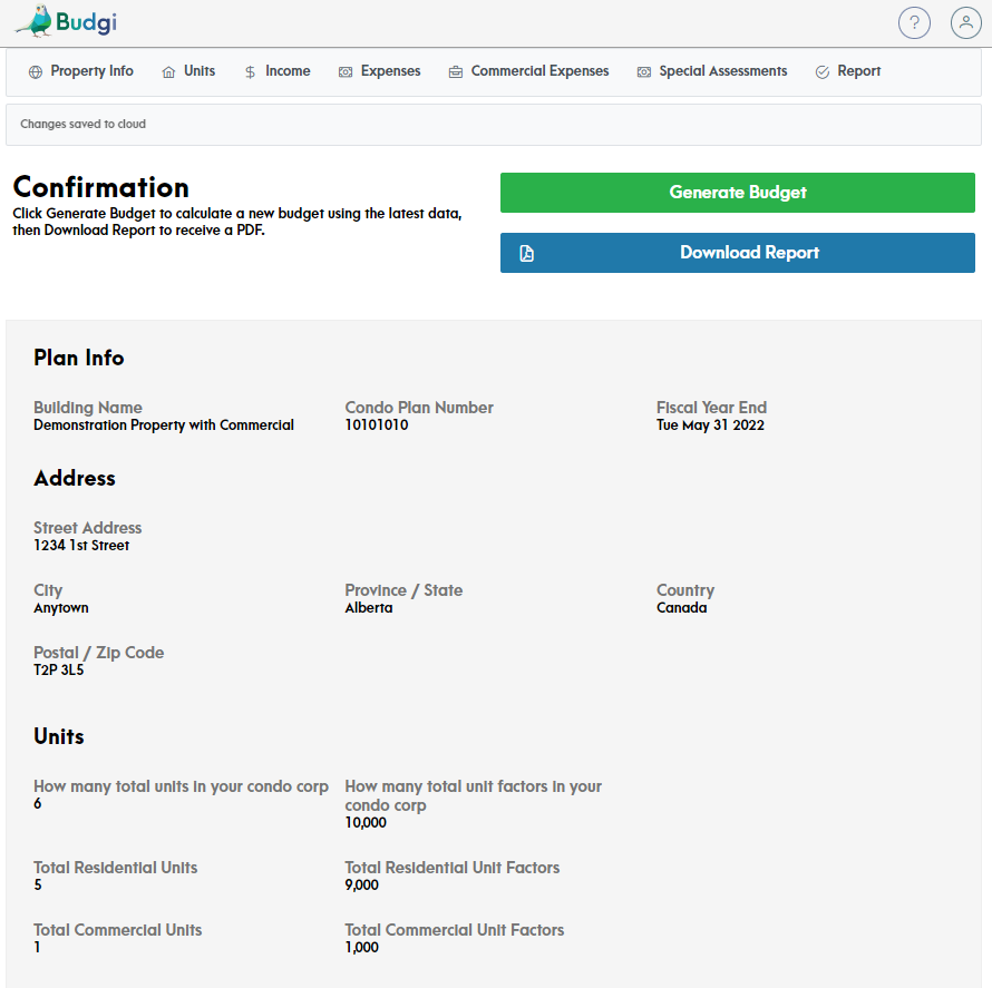 If everything looks correct click on download report and a PDF file of your budget, monthly fees per unit, commercial fees and special assessment per unit. If any of the items are incorrect you can always go back, correct the entry error and then click on Generate Budget and Download Report again to confirm everything has been corrected.