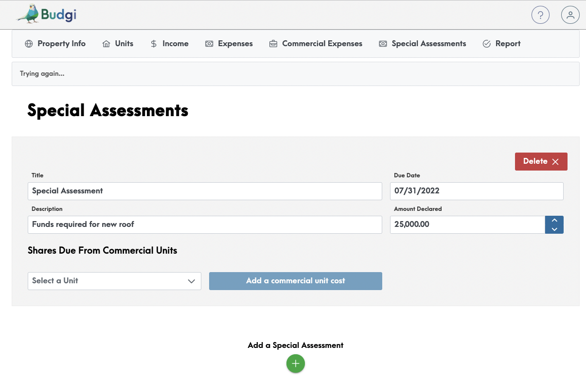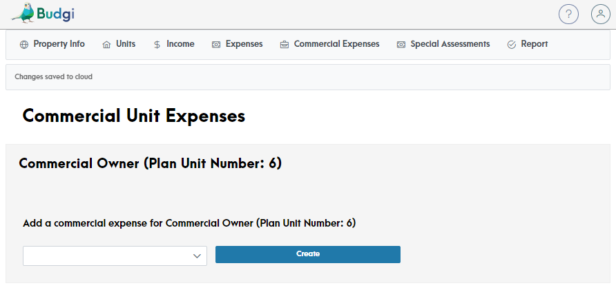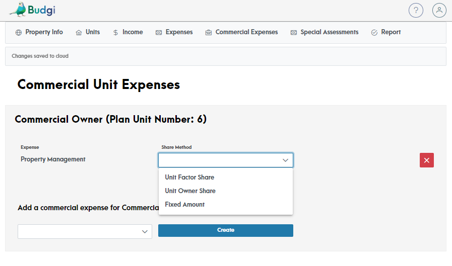 Once you’ve entered all your expense items for you can add a special assessment if you have accounted for one in the coming fiscal year. You can also select what sharing calculation is applicable for the Commercial Owner.
